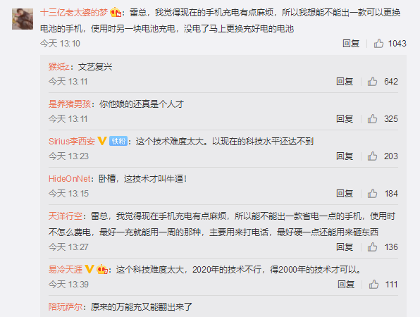在评论中,有人荐言:“雷总,我觉得现在的手机充电有点麻烦,所以我想能不能出一款可以更换电池的手机,使用时另一块电池充电,没电了马上更换充好电的电池。”