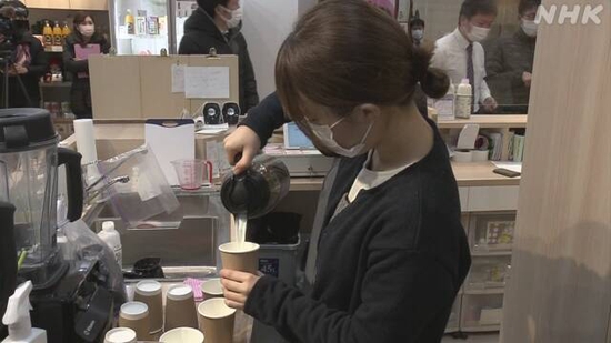 店铺特别准备了使用福冈县产牛奶制作的热牛奶,一杯180毫升的热牛奶售价为50日元(3-4元人民币),是同款牛奶零售价的一半左右。购买热牛奶的一位50多岁的女性说:“我是来买热牛奶的,希望喝了能有所帮助。喝起来很方便,味道也很好。”