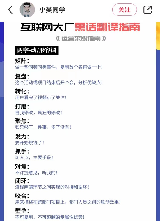 当然了,这样的职场新人已经不多了,现在不学两手黑话都不敢参加面试,社交媒体上的“互联网黑话大全”一抓一把,包教包会。