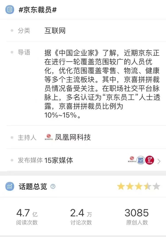 而传闻中的京东裁员则更加来势凶猛。28日,#京东裁员#的消息一度冲到微博热搜,单日话题阅读超过1.4亿次。不少网友在职场社交平台上分享自己的被裁经历。