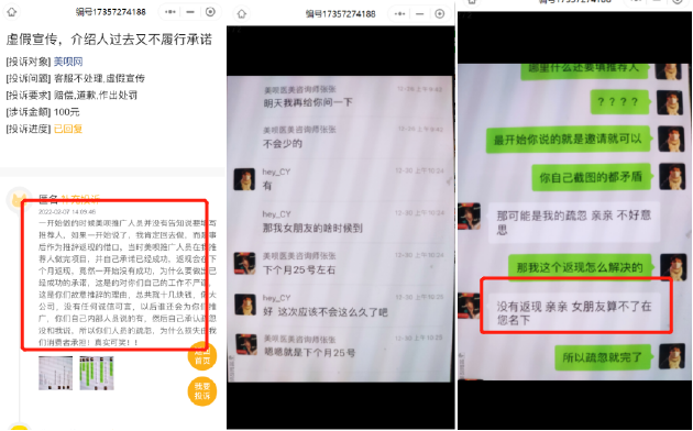 另据黑猫投诉显示,美呗“医美查”开发单位旗下产品“美呗”还涉及虚假宣传,以及消费者介绍客户返现等行为。有消费者指出:“美呗平台骗人,拒绝履行承诺,上个月介绍了朋友去做了2000的项目,说是可以返现给我5%,结果现在来一句,不算我名下,缺乏诚信!”
