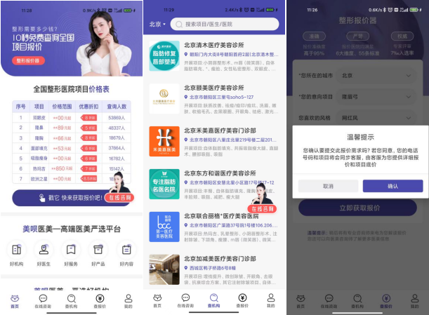 下载该App体验后发现,安卓“整形报价器”的App界面,与iOS系统美呗“医美查”App有着同样的功能。进入首页,首先是全国整形医院项目价格表,点击首页“查报价”后,则需要选择所在城市、意向项目、喜欢风格、选择机构时关注的因素等,选择完成以后,点击下方“立即获取报价”,则会收到提示“您确认要提交此报价需求吗?若同意,您的电话号码和项目将同步客服,由客服为您提供详细报价和项目底价”。