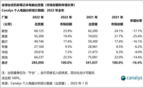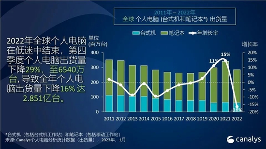 2022年全球个人电脑出货量下降16% 跌至2.85亿台