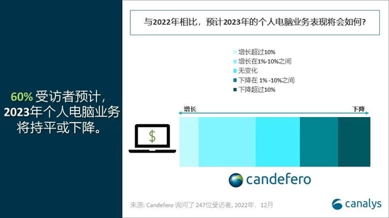 Canalys高级分析师IshanDutt表示:“正如我们预期的那样,全球个人电脑市场在第四季度面临进一步的增长阻力,情况并未在2022年底有所改善。由于2021年同期笔记本电脑和台式机的出货量创下历史新高,这使得今年的降幅尤其明显。厂商和零售商旨在通过大幅折扣活动刺激消费者支出,尽管略有成效,但这还不足以带动销量大幅增加。随着美国和欧洲等主要市场的能源和基础商品成本不断上涨,消费者准备推迟更新设备,个人电脑等大件商品的消费支出退居二线。与此同时,在利率上升、招聘放缓以及预计明年年初出现经济衰退的情况下,在商业领域,公共和私营部门的预算都面临紧缩。2022年12月对约250家渠道伙伴进行的一项问卷调查显示,60%的伙伴预计其个人电脑业务收入在2023年将持平或出现下降。个人电脑行业面临的艰难环境预计将持续到明年下半年。”