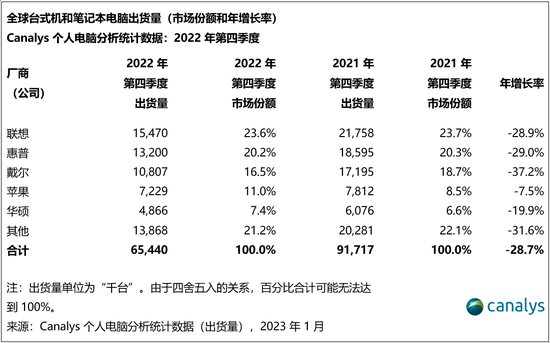 2022年底,全球个人电脑市场表现低迷,第四季度台式机和笔记本电脑的总出货量下降29%,跌至6540万台。在经济环境恶化的情况下,假日季支出在减少,因此继前三个季度后,个人电脑市场在本季度再次遭遇下降。2022年全年的总出货量为2.85亿台,与出货量较大的2021年相比,下降了16%,当时所有终端用户的需求都达到最高峰。