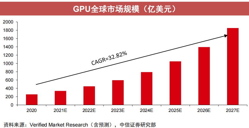 根据Verified Market Research数据,2020年,全球GPU市场规模为254.1亿美元(约合人民币1717.2亿元)。随着需求的不断增长,预计到2028年,这一数字将达到2465.1亿美元(约合人民币1.67万亿元),年复合增长率(CAGR)为32.82%。