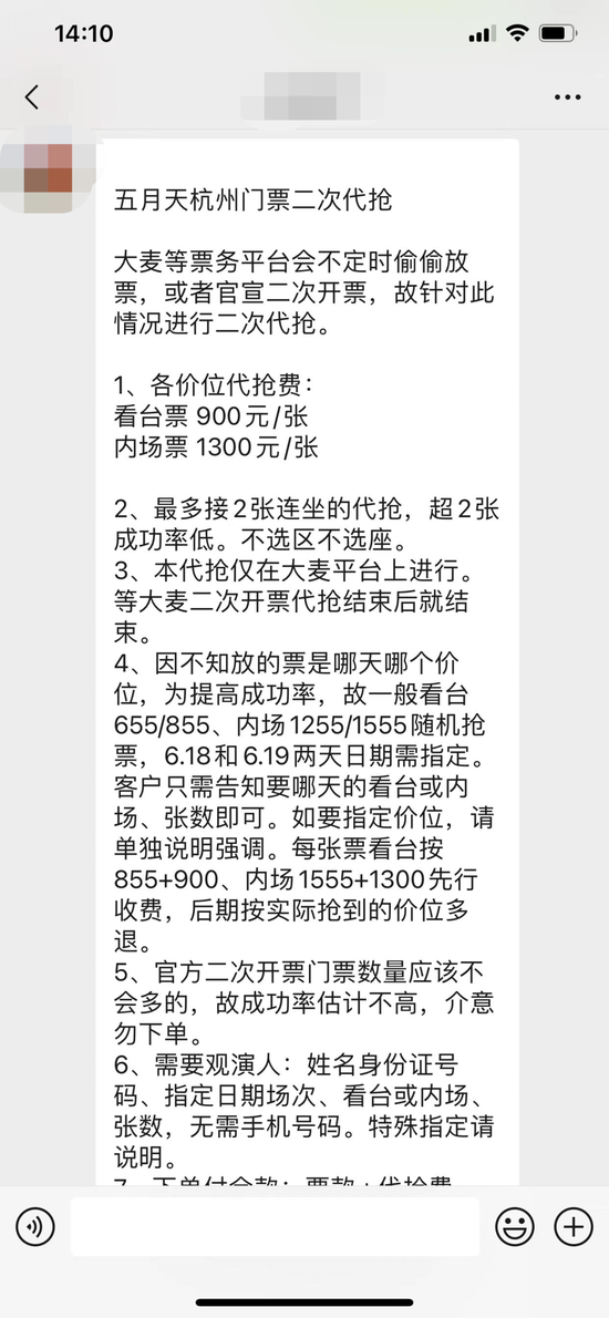令人意想不到的是,黄牛的代抢费几乎已经可以再买一张原价的演唱会门票了。锌财经咨询了几个黄牛了解到,一张门票的代抢费在400元到1000多元。比如林俊杰上海站内场票的代抢费在400-600元左右,五月天杭州站看台票的代抢费是900元,内场票的代抢费是1300元。