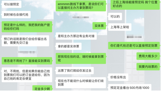 黄牛有了这种内部关系,甚至可以接预定票。只要消费者交一笔定金,黄牛就可以在演唱会官方正式售票前为其留出名额,等到出票后直接内部实名制购票。