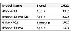纵向来看,在2022年上半年,iPhone 13以3,370万部登顶,而较高端的iPhone 13 Pro Max则只能以2,300万部屈居次席。