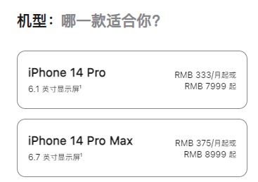 在苹果中国官网上,目前入门级iPhone 14的起售价为5,999元人民币,iPhone 14 Pro为7,999元人民币,iPhone 14 Pro Max价格更高,为8,999元人民币。