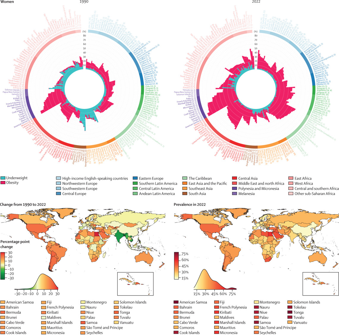 为全面了解全球肥胖率,超过1,500名研究人员调查了190多个国家逾2.2亿人的体重和身高。成人肥胖的定义是BMI大于等于30,儿童肥胖定义随体重和年龄而变。他们发现,2022年可能有超过8.79亿成年人和1.59亿儿童肥胖。