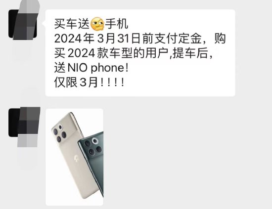 3月13日下午消息,蔚来推出了买车送手机的优惠活动,主要面向2024款车型。一位蔚来销售发布的信息显示,“买车送手机2024年3月31日前支付定金,购买2024款车型的用户,提车后,送NIO phone!仅限3月!”