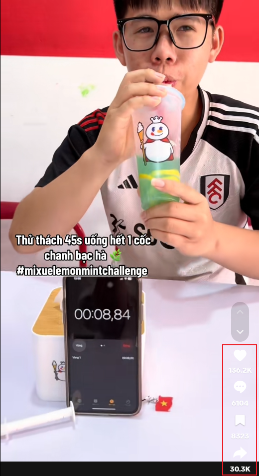 比如说,前两周周在洋抖上,蜜雪冰城发起了一个 45 秒内喝完一杯柠檬水挑战,就轻松策划出了一场病毒式传播。
