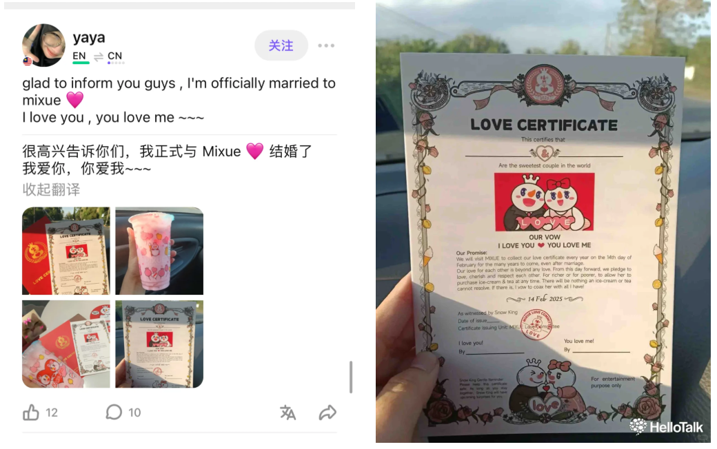 比如在情人节喝一杯蜜雪,就可以和雪王领结婚证。