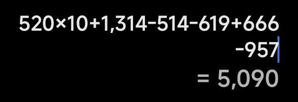 新娘先吊足了丈夫的胃口,接着让他解一道计算题:520×10 + 1314 - 514 - 619 + 666 - 957。