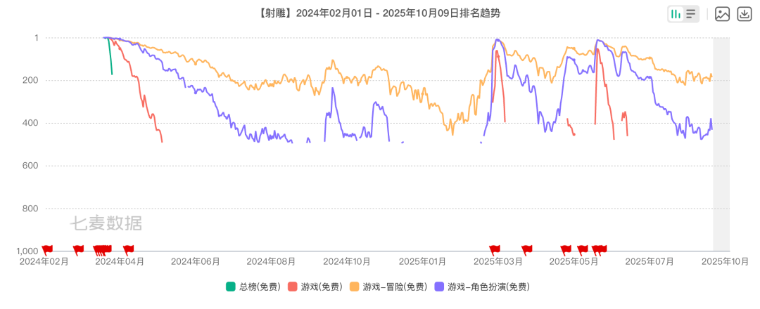 之后《射雕》 2.0 也做过其他努力,比如趁热度上线搜打撤玩法的 “ 隐峰逐迹 ”,可在几乎是直线下滑的排名趋势面前,为时已晚。