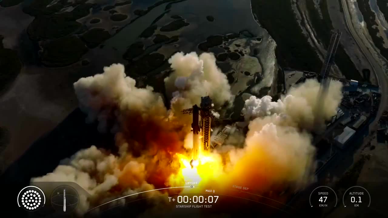 发射后2分46秒,上面级星舰飞船发动机点火,与超级重型助推器顺利分离,继续飞向太空。后者成功点火减速,于发射后6分42秒以垂直姿态在墨西哥湾顺利溅落。此次测试验证了一项未来着陆新技术:在最终制动阶段点燃13台发动机的着陆方案。助推器在目标区域上空短暂悬停后,按计划受控溅落于海湾。