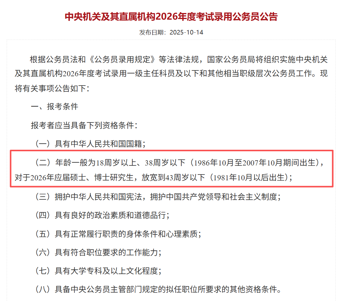 值得一提的是,中央机关及其直属机构2026年度考试录用公务员公告显示,报考者年龄一般为18周岁以上、38周岁以下(1986年10月至2007年10月期间出生),对于2026年应届硕士、博士研究生,放宽到43周岁以下(1981年10月以后出生)。