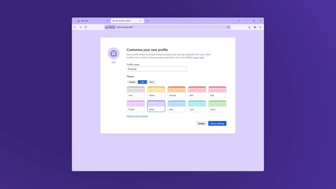 Firefox 144引入了配置文件管理功能,用户可以创建多个配置文件,将浏览数据分开管理,例如学校、工作、娱乐等。