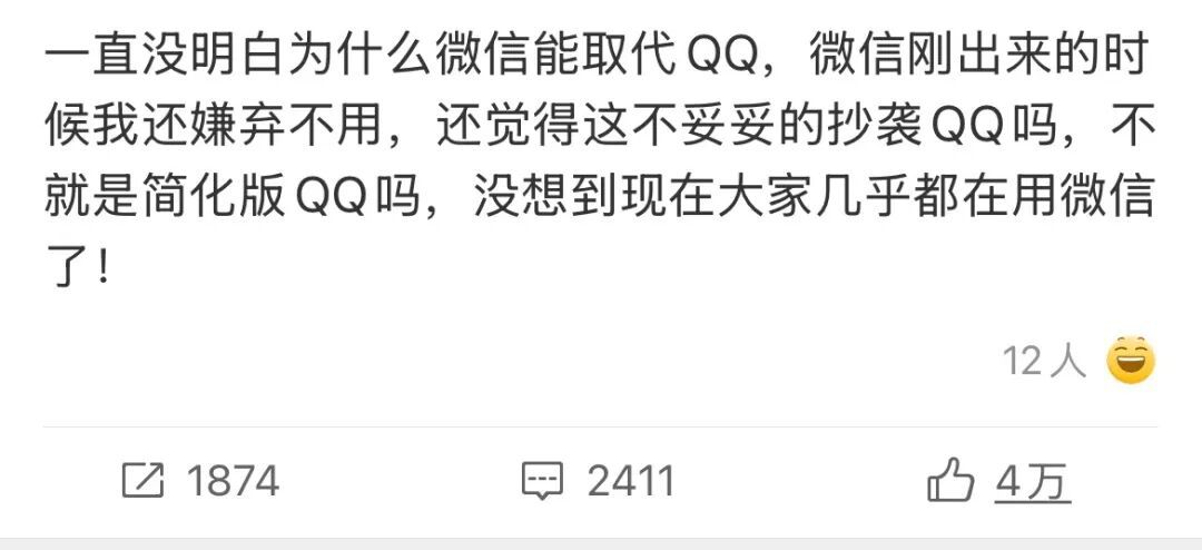 不得不说的是,互联网行业发展太快了,以至于没有经历过微信发展的人就认为QQ可能更好,并诘问,为什么大家现在都跑去用微信去了?