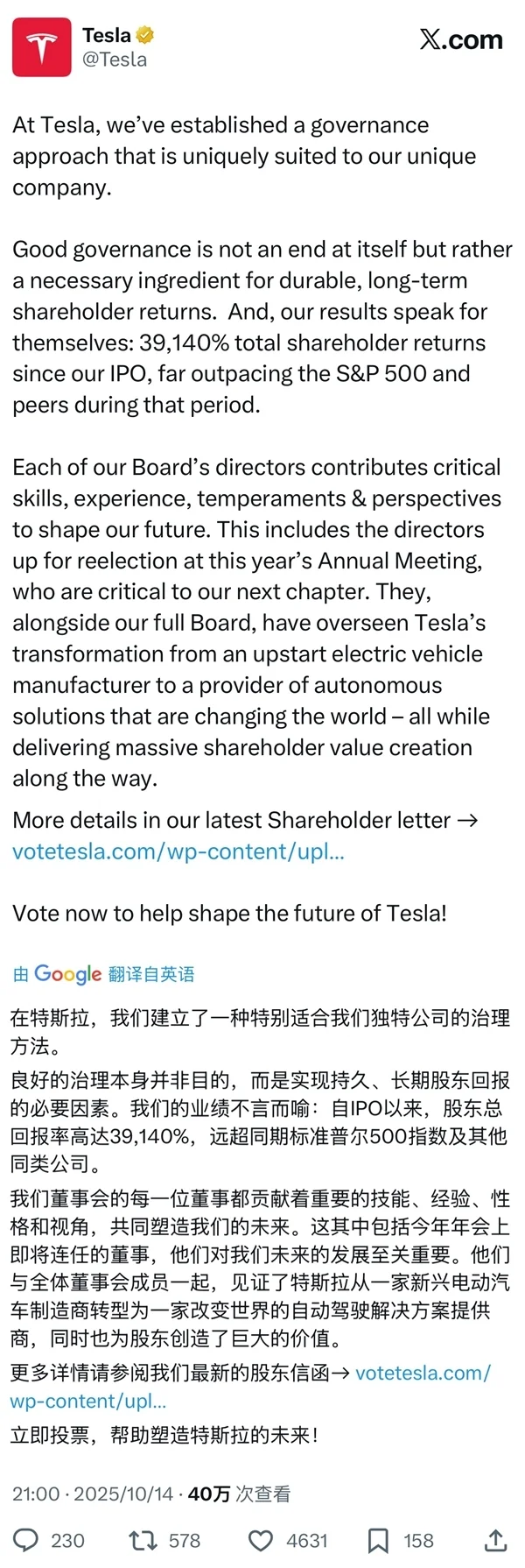 特斯拉强调,良好的公司治理并非终极目标,而是实现持久、长期股东回报的必要基石。