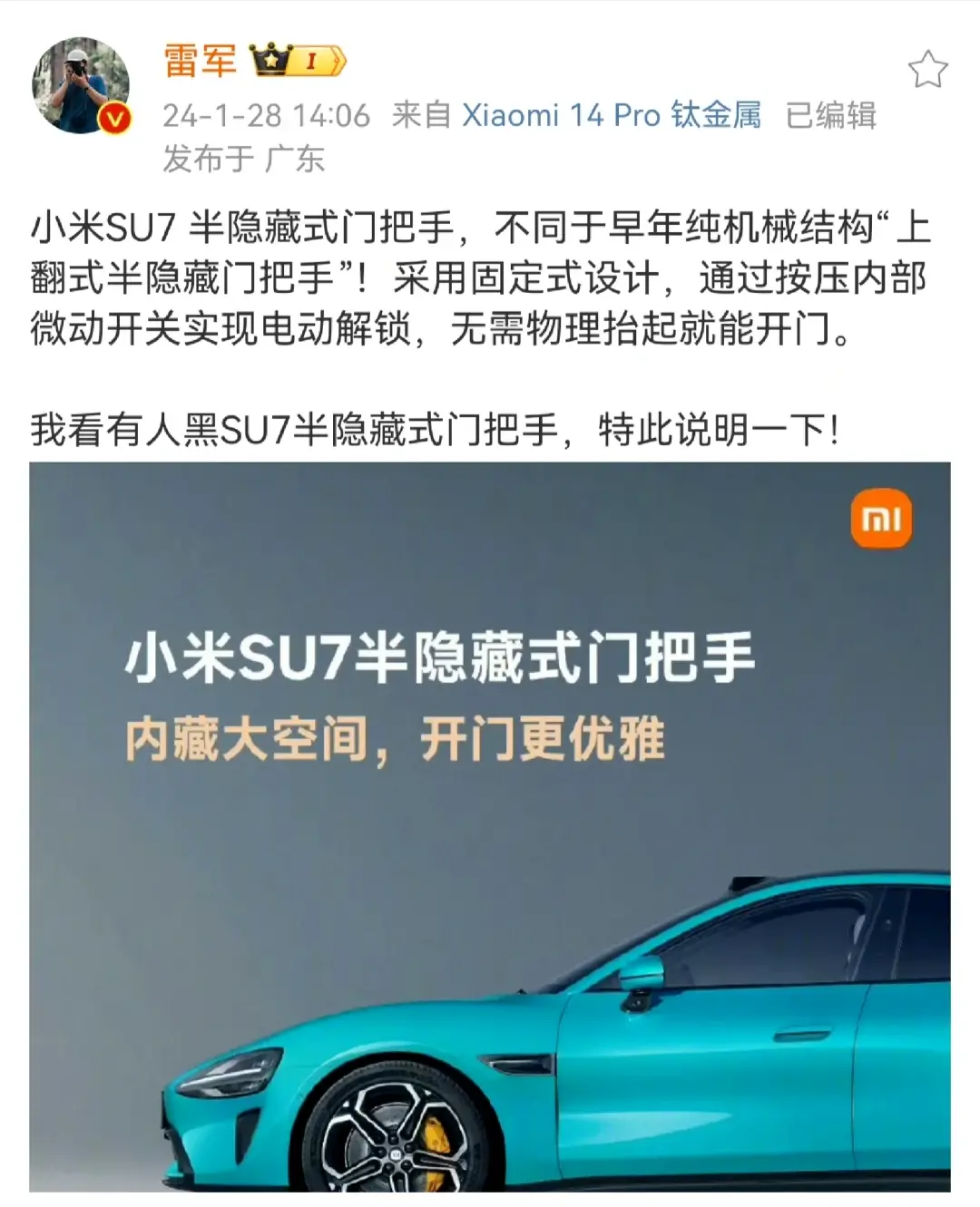 而雷军曾经在微博中详细介绍小米的车门设计: