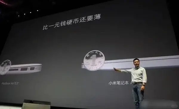 小米发布笔记本的时候,对标的是苹果的 MacBook,宣传语是“比一元硬币”还要薄——但是竖着的一元硬币。