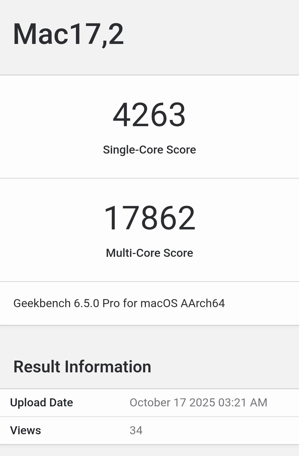 数据显示,M5 MacBook Pro的单核成绩为4263分,略高于M5 iPad Pro的4138分,比上一代M4芯片提升了近10%。