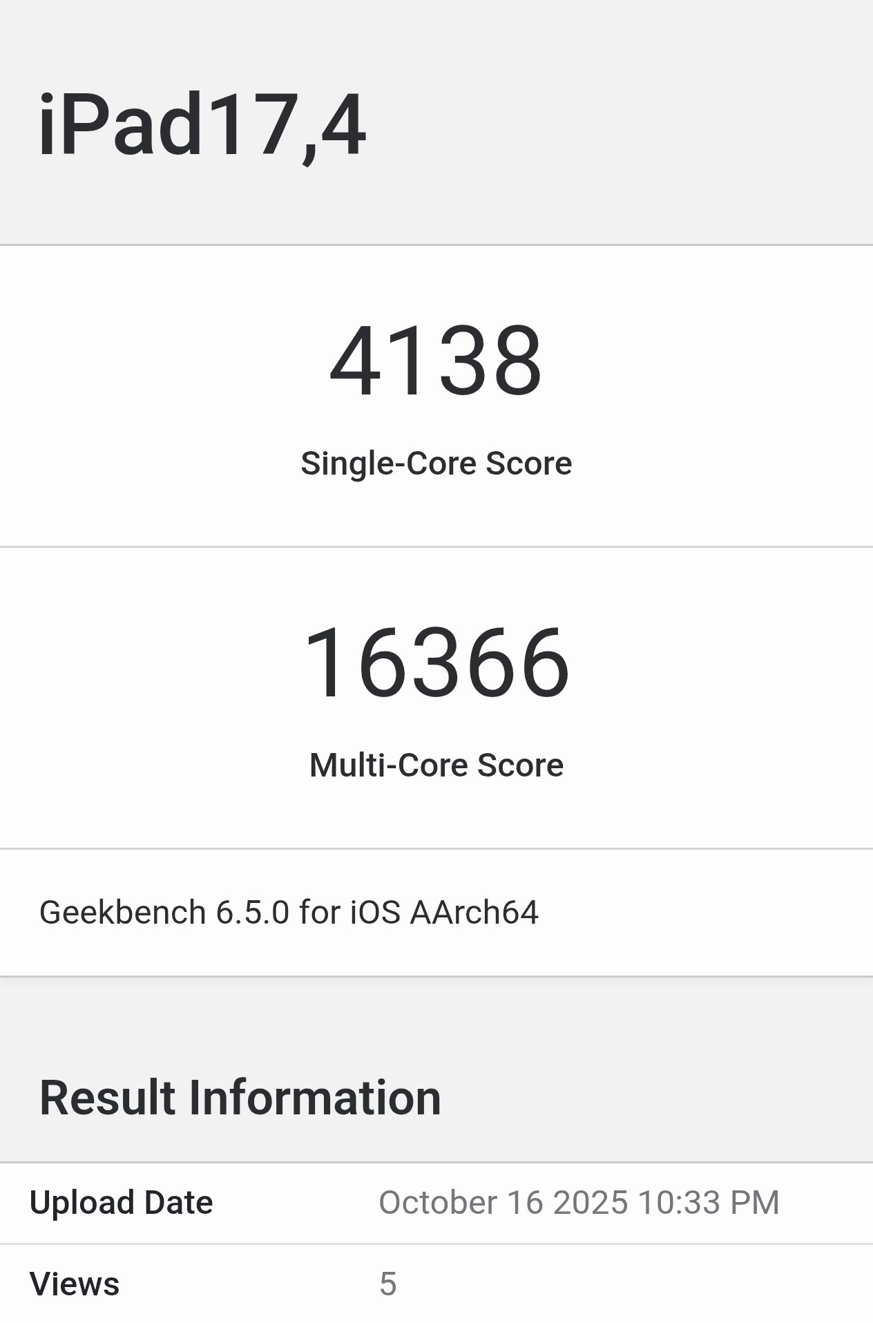 MacBook Pro版本M5的多核跑分达到了17862分,比iPad Pro版本高出约9%,主要得益于MacBook Pro更强大的主动散热系统,能让芯片以更高的频率(4.61 GHz对比4.43 GHz)和更持久的性能运行。