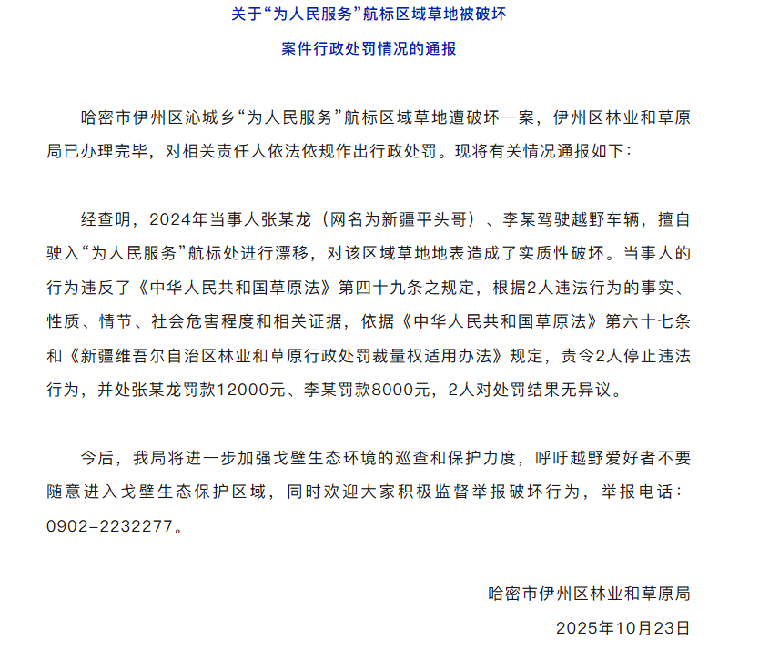 经查明,2024年当事人张某龙(网名为新疆平头哥)、李某驾驶越野车辆,擅自驶入“为人民服务”航标处进行漂移,对该区域草地地表造成了实质性破坏。
