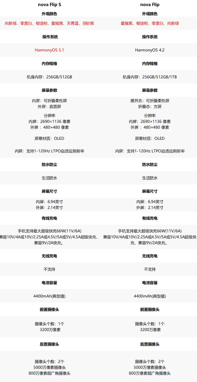 今日,华为nova Flip S正式开售,售价3488元起,首发优惠100元,到手3388元起,这是华为最便宜的折叠屏手机。根据华为客服提供的nova Flip S、nova Flip重点参数对比,nova Flip S新增天青蓝、羽砂黑两款配色,出厂预装鸿蒙OS 5.1操作系统,其他规格基本与nova Flip一致。