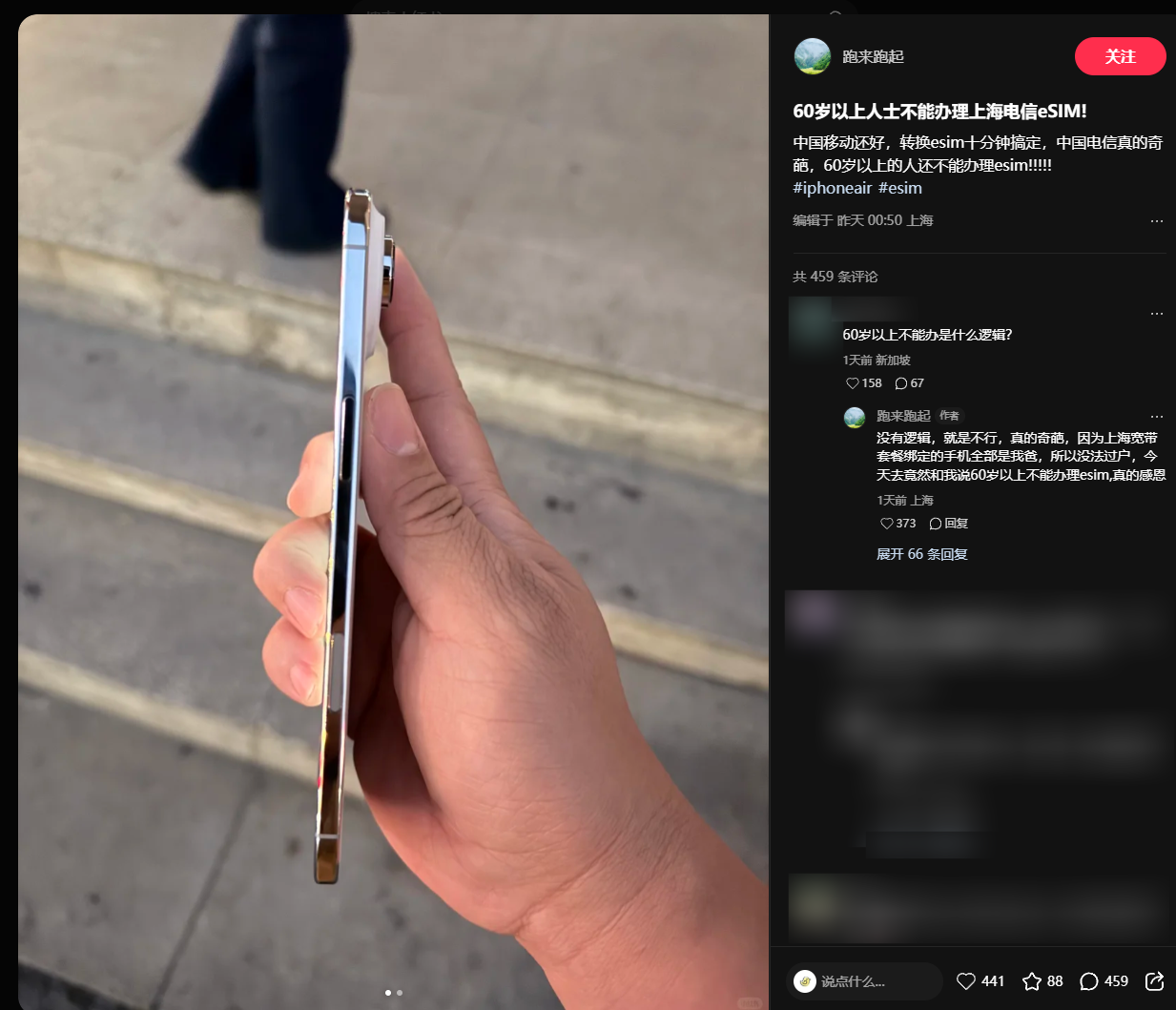 日前,iPhone Air 国行版发售,标志着中国智能手机市场正式迈入eSIM时代。然而,有网友发帖称,购买iPhone Air后前往中国电信营业厅办理eSIM业务时,却因年龄超过60岁遭到拒绝。