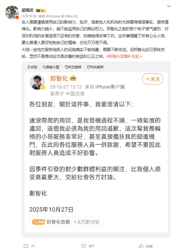 “影响力越大,越不能滥用自己的舆论权力。郑智化之前的那个帖子语气激烈,对深圳机场的名誉造成不应有的伤害,的确做得非常不对。”