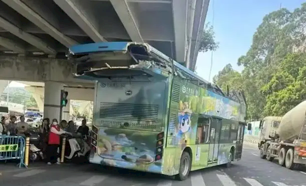 双层公交撞上立交桥被削顶 官方通报:驾驶员借道桥底行驶致事故