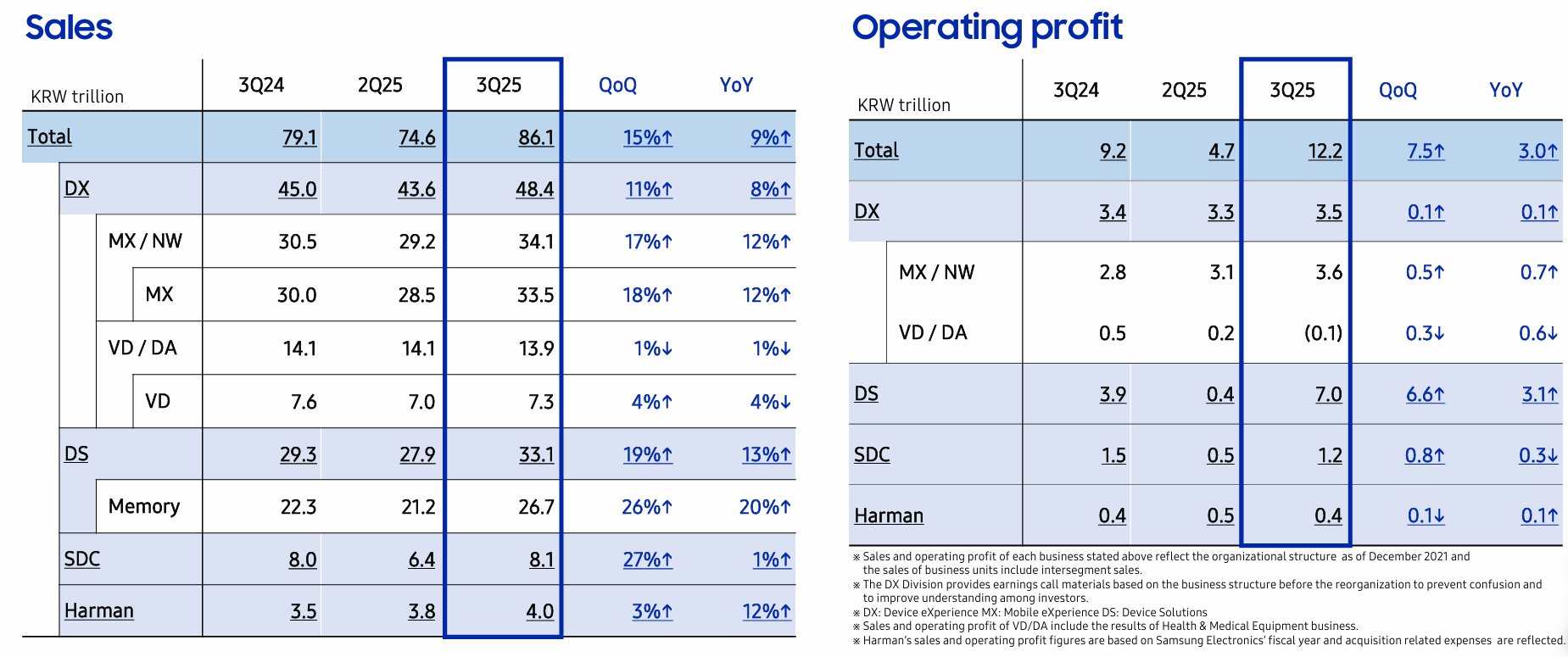 主要负责半导体业务的DS部门(设备解决方案部门)第三季度销售额同比增长13%至33.1万亿韩元,其中存储芯片销售额同比增长20%至26.7万亿韩元;该部门第三季度营业利润为7.0万亿韩元,较上年同期的3.9万亿韩元增长了79%,远高于分析师平均预期的4.7万亿韩元。