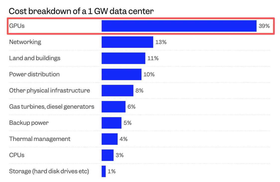 AI数据中心的最大单一成本在于计算芯片本身。伯恩斯坦指出,大约39%的总支出用于GPU,其中以英伟达的GB200及其即将推出的AI芯片(如Rubin系列)为主。