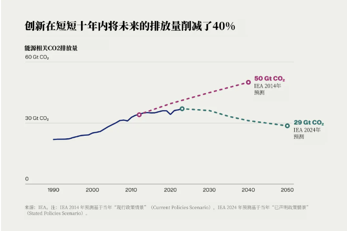 比尔盖茨指出,过去十年,国际能源署对2040年全球二氧化碳排放量的预测从500亿吨降至300亿吨,这得益于清洁技术发展。