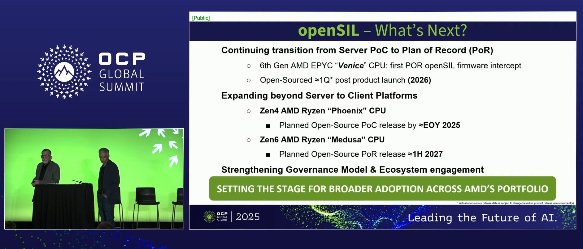 2025年OCP全球峰会上,AMD官方第一次明确提到了Zen 6产品代号,包括数据中心级的Venice EPYC、消费级的Medusa Ryzen。这次演讲的主题是AMD开放式固件“openSIL”,也就是Open Firmware。