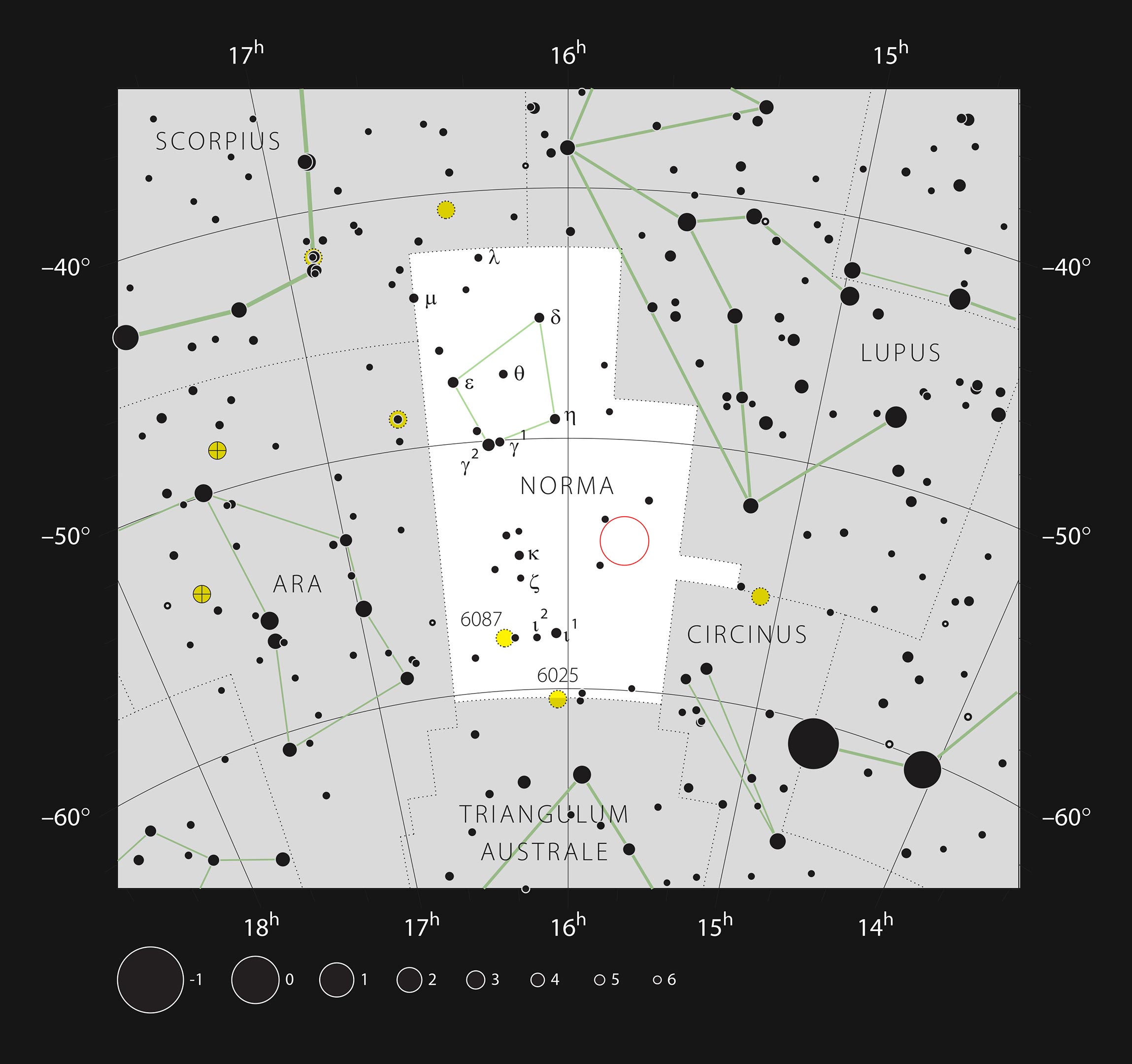 这只“宇宙蝙蝠”距离地球约一万光年,位于南天天区的圆规座与矩尺座之间。云团在天空中的延展范围大致相当于四个满月,其形态仿佛正在扑向上方发光的区块,令人产生捕猎者的联想。实际上,这个神秘结构是一座恒星孕育场,内部新生恒星发射出的强烈辐射使周围的氢气发出深红光辉。暗色的丝状结构则组成了蝙蝠的“骨翼”,这些区域因尘埃致使光线受阻,显得更加阴暗与密集。