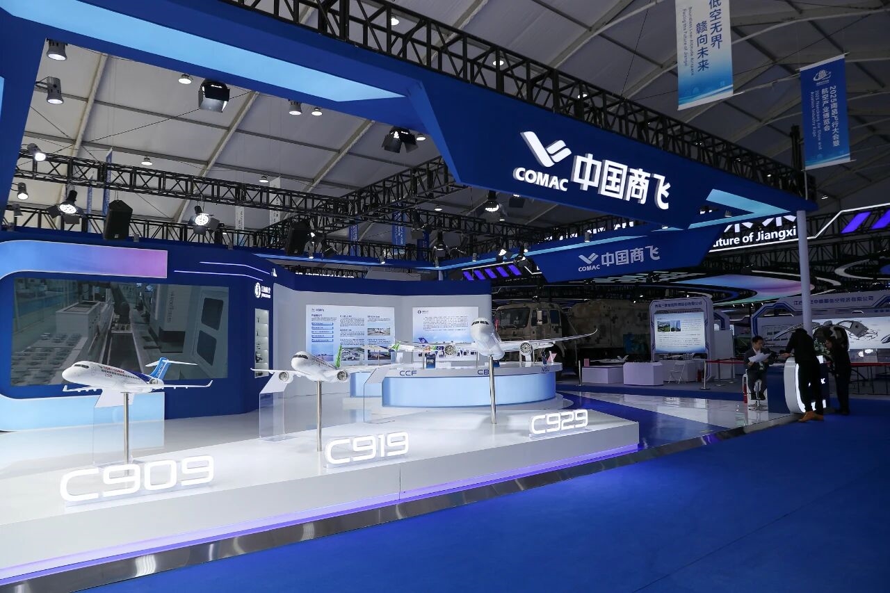 2025南昌飞行大会暨航空产业博览会上,中国商飞的三架C909、C919飞机组成编队,为现场观众带来了一场震撼的空中表演。执行本次编队飞行的长机为C909,两架僚机为C919。