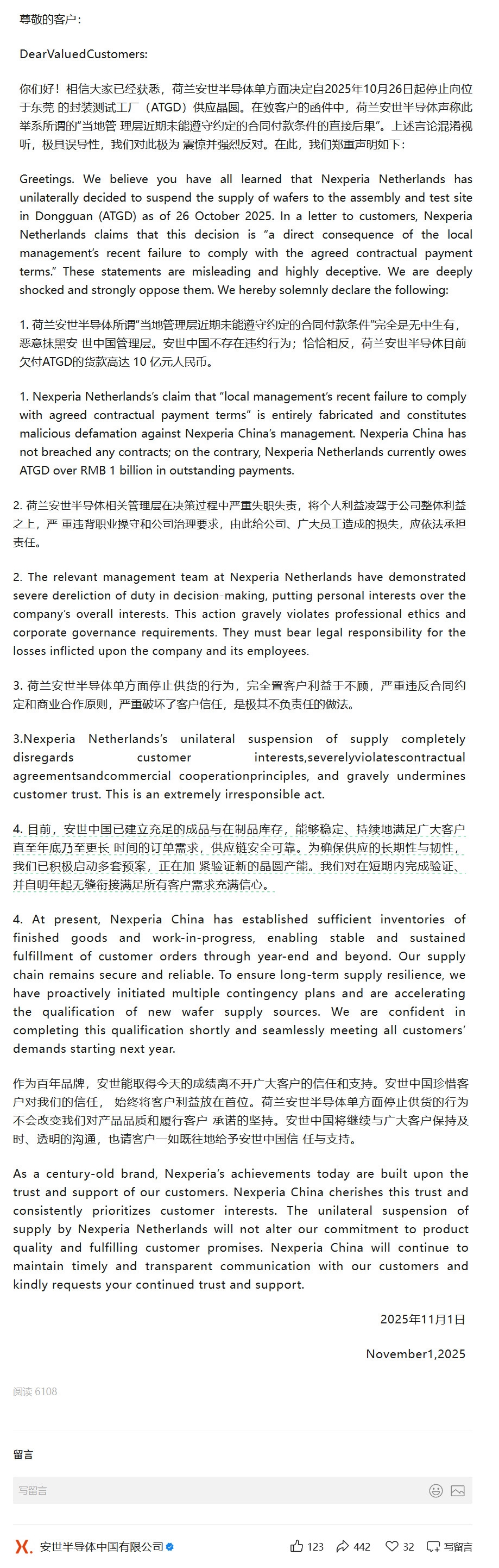 这封信的签署日期为10月29日,由安世半导体临时首席执行官Stefan Tilger签署。该信件称,安世半导体于10月26日对其位于中国东莞市的封测厂实施了暂停供应,称这是“当地管理层最近未能遵守商定的合同付款条款的直接后果”。