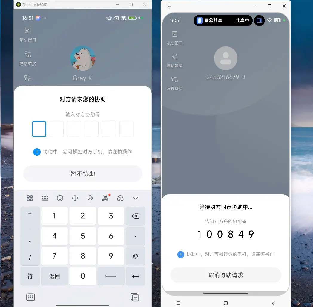 点击远程协助按钮后,咱们还得让对方填入自己手机所显示的“协助码”。