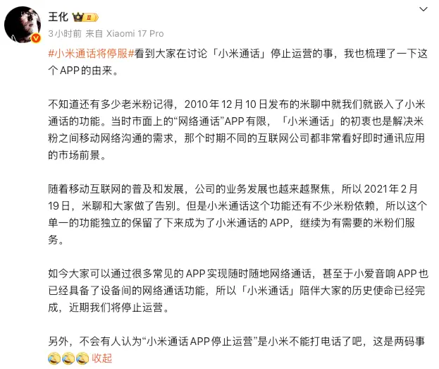 最近小米通话发布了个公告,表示将于 2025年12月3日停止服务。这事儿出来后。我看网上很多人把它误会成——“小米手机不能打电话啦。”搞得最后小米官方人员@王化,都出来澄清了一波。它的关停,完全不影响咱们打电话发短信。因为它本质上只是一个App,是当年米聊退场后留下的分支。