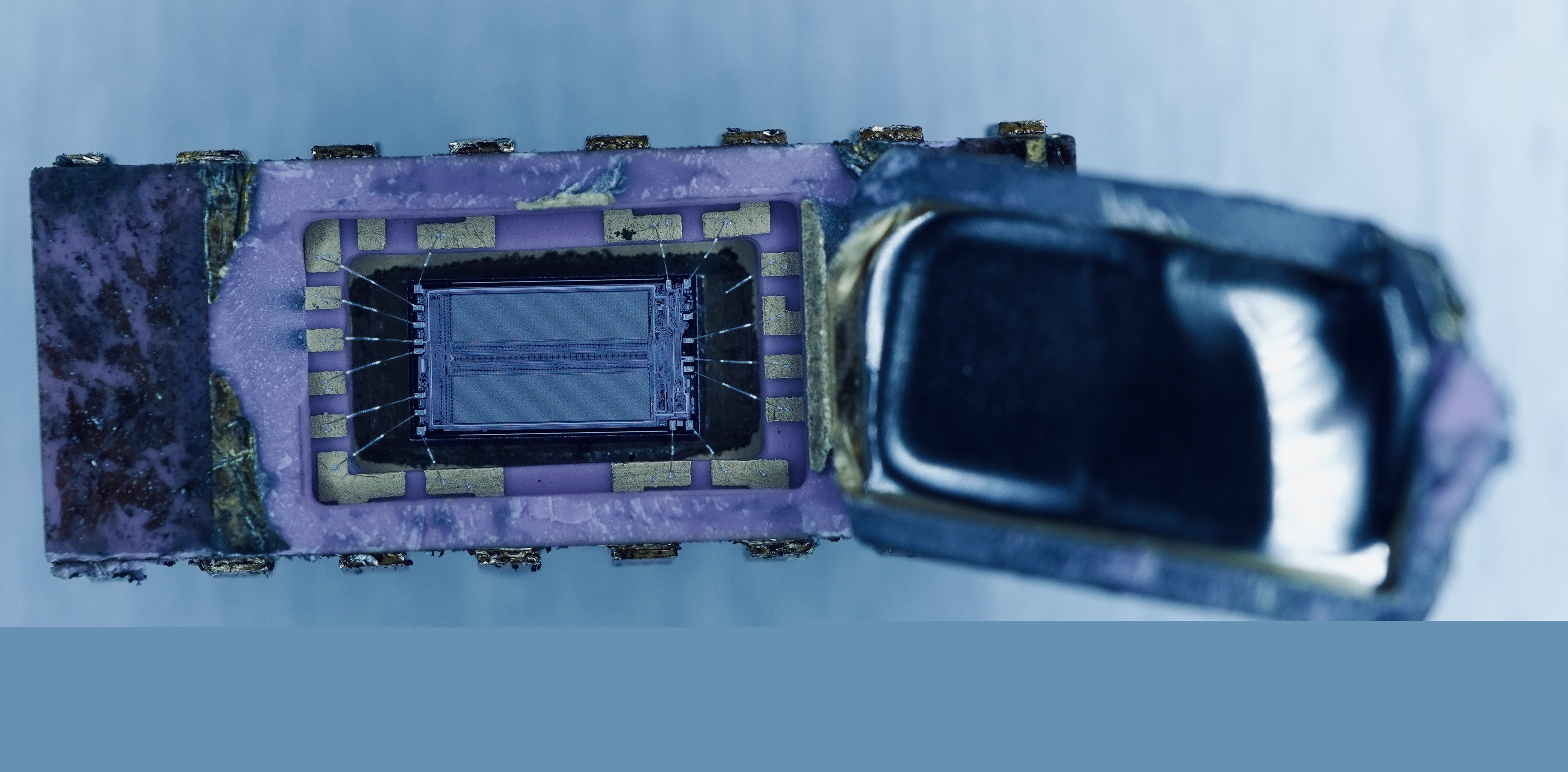 CPU Duke对K565PY3的第一印象是它坚固的“鱼罐头”式结构。不过,他很快就拆开了外壳,开始对芯片进行深入的检查。首先使用显微镜进行了观察,芯片的结构和大量的存储单元清晰可见。