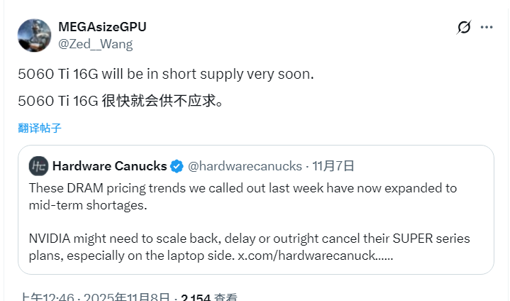 RTX 5060 Ti 16GB货源告急 很快缺货涨价