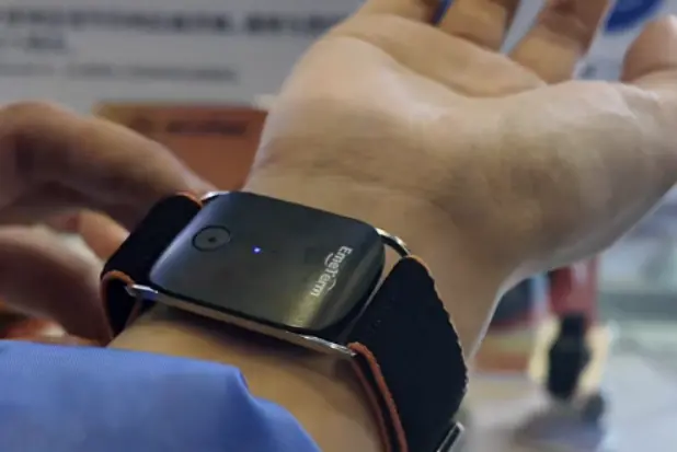 据工作人员介绍,“这个手环会释放出电流,电击你的穴位神经让你精神百倍,有咖啡的效果,让这个手环不断的鞭策你自己,让自己能够集中注意力,更快的进步做出劳动成果。”