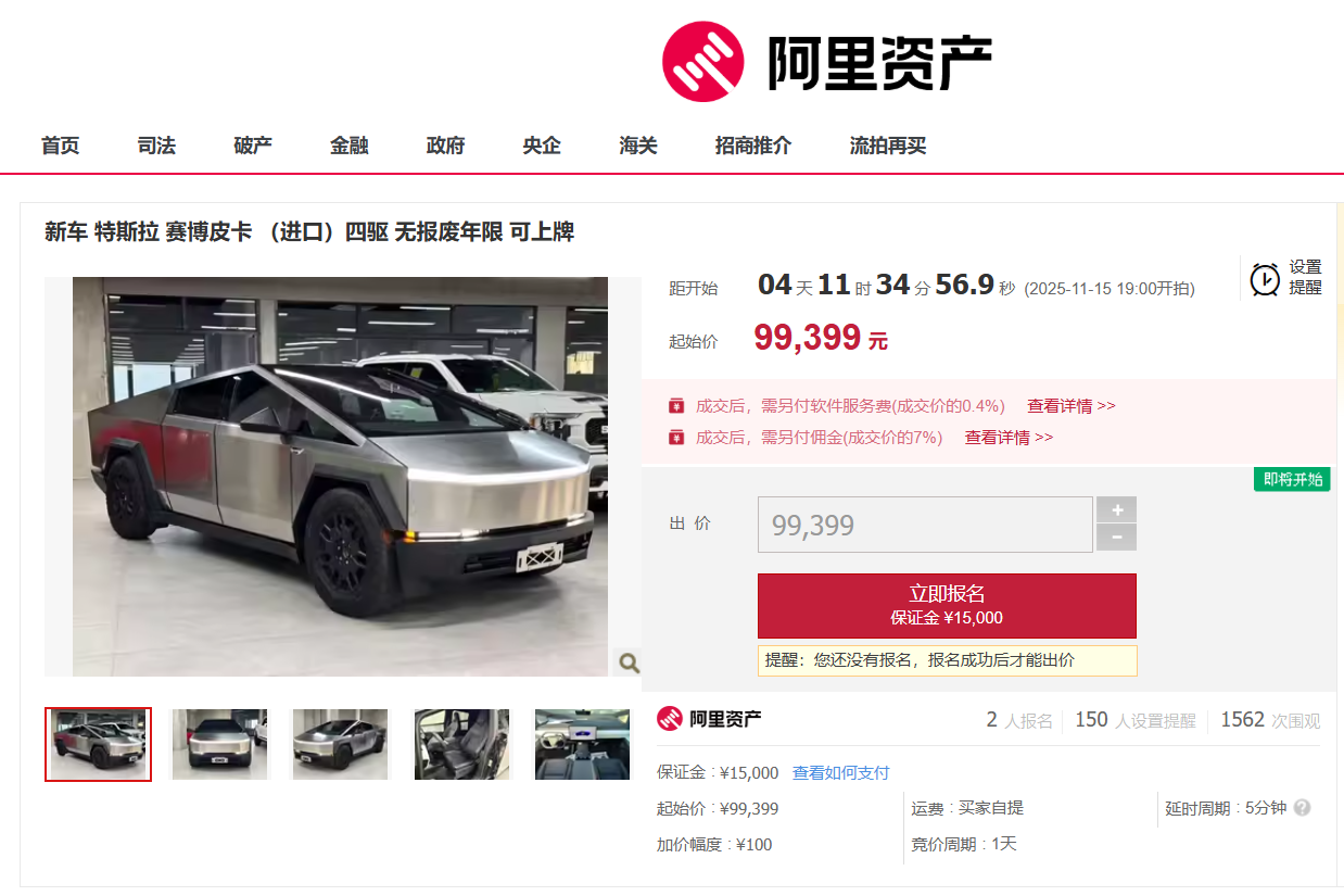 阿里资产拍卖平台显示,一辆进口的全新特斯拉Cybertruck皮卡上线拍卖。拍卖平台详情显示,车辆为进口四驱版型,无报废年限,车辆拥有完整路权,可上绿牌,车辆起拍价为99399元,加价幅度为100元,拍卖将于11月15日19:00开拍,目前已有150人设置提醒,2人参与报名。