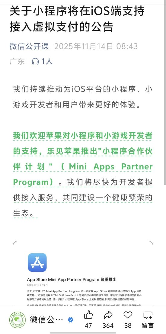 今日,“微信公开课”官方公众号发布《关于小程序将在iOS端支持接入虚拟支付的公告》,官方表示我们持续推动为iOS平台的小程序、小游戏开发者和用户带来更好的体验。微信官方还表示,我们欢迎苹果对小程序和小游戏开发者的支持,乐见苹果推出“小程序合作伙伴计划”(Mini Apps Partner Program)。我们将尽快为开发者提供接入服务,共同建设一个健康繁荣的生态。