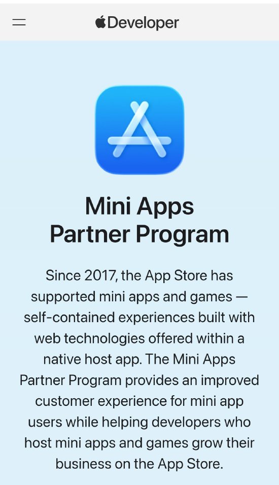 11月14日凌晨,苹果正式宣布‘Mini Apps 合作伙伴计划’,标志着小程序首次进入 iOS 体系,成为制度化的合规应用形态。该计划为开发者提供新的商业化路径,并将小程序纳入苹果监管框架。苹果表示,小程序(Mini Apps)是‘基于 Web 技术如 HTML5 和 JavaScript 构建的自包含体验’,分发于‘宿主 App’内,无需安装即可访问。宿主 App 必须同时支持 iOS 与 iPadOS,并采用‘Advanced Commerce API’(高级商务 API)和‘Declared Age Range API’,以确保支付透明、内容合规及适龄访问。