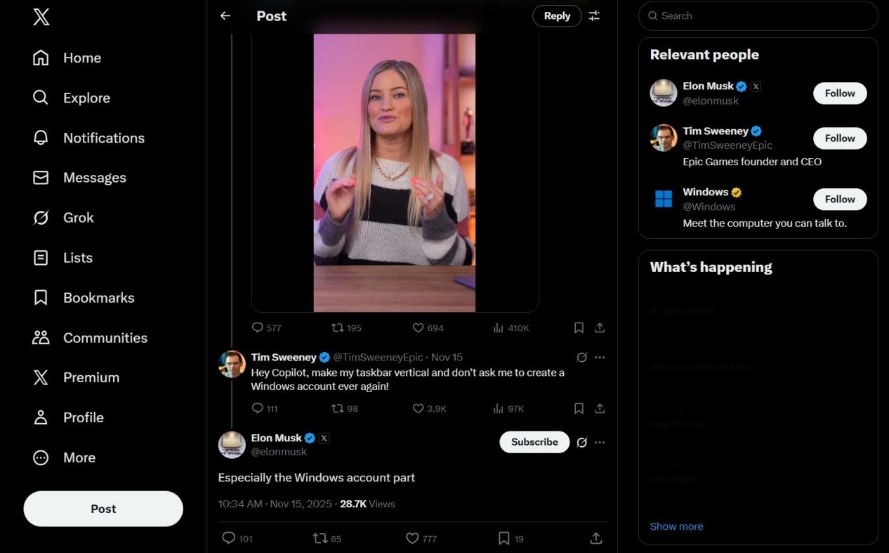 Epic Games CEO Tim Sweeney日前在微软的一则Copilot广告下方公开炮轰Windows 11,抨击其移除任务栏自定义功能、强制用户使用微软账户等做法。随后,以直言不讳著称的特斯拉CEO埃隆·马斯克(Elon Musk),也跳出来表示支持。